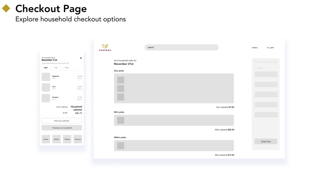 The "checkout as a household" feature allows individual customers to make their own selections for the shared box asynchronously while being able to see what other people in the house chose for their produce. This would not only help them reduce food waste by avoiding purchasing redundant items but also alleviate any stress of having to congregate in front of a bigger screen to make a collective decision on their order.